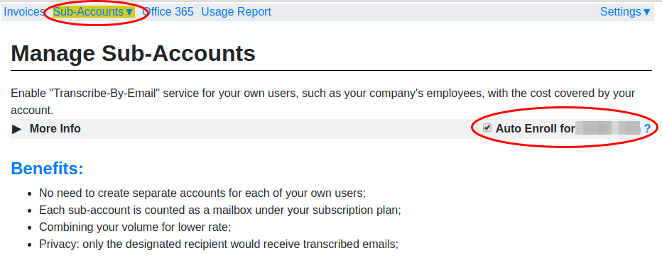 For security reasons, Nexiwave will only allow to "Auto-Enroll" for the email domain that your Nexiwave account was registered with. Please contact us if you are a service provider and would like to set up "Auto-Enroll" for other email domains (such as your customers' email domains) so your customers' email addresses can be Auto-Enrolled as your Sub-Accounts.