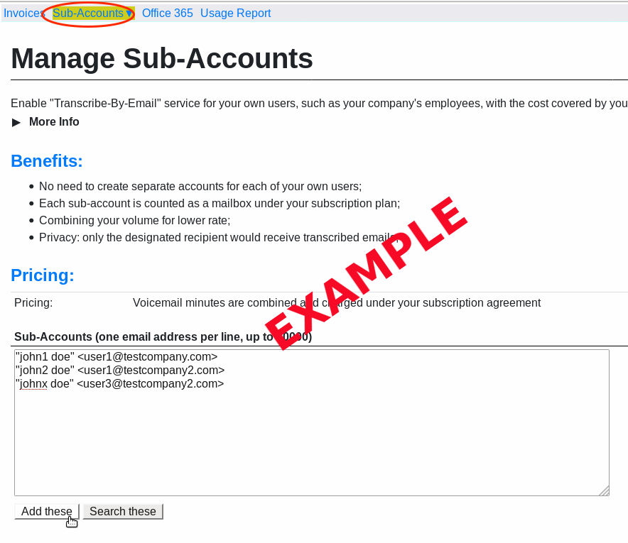 Step 1: List your users' email addresses in your Nexiwave "Sub-Accounts" page.