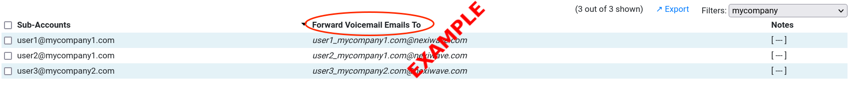 Step 2: After added, each Sub-Accounts will be provided a Nexiwave custom email address in the "Forward Voicemail Emails to" column.